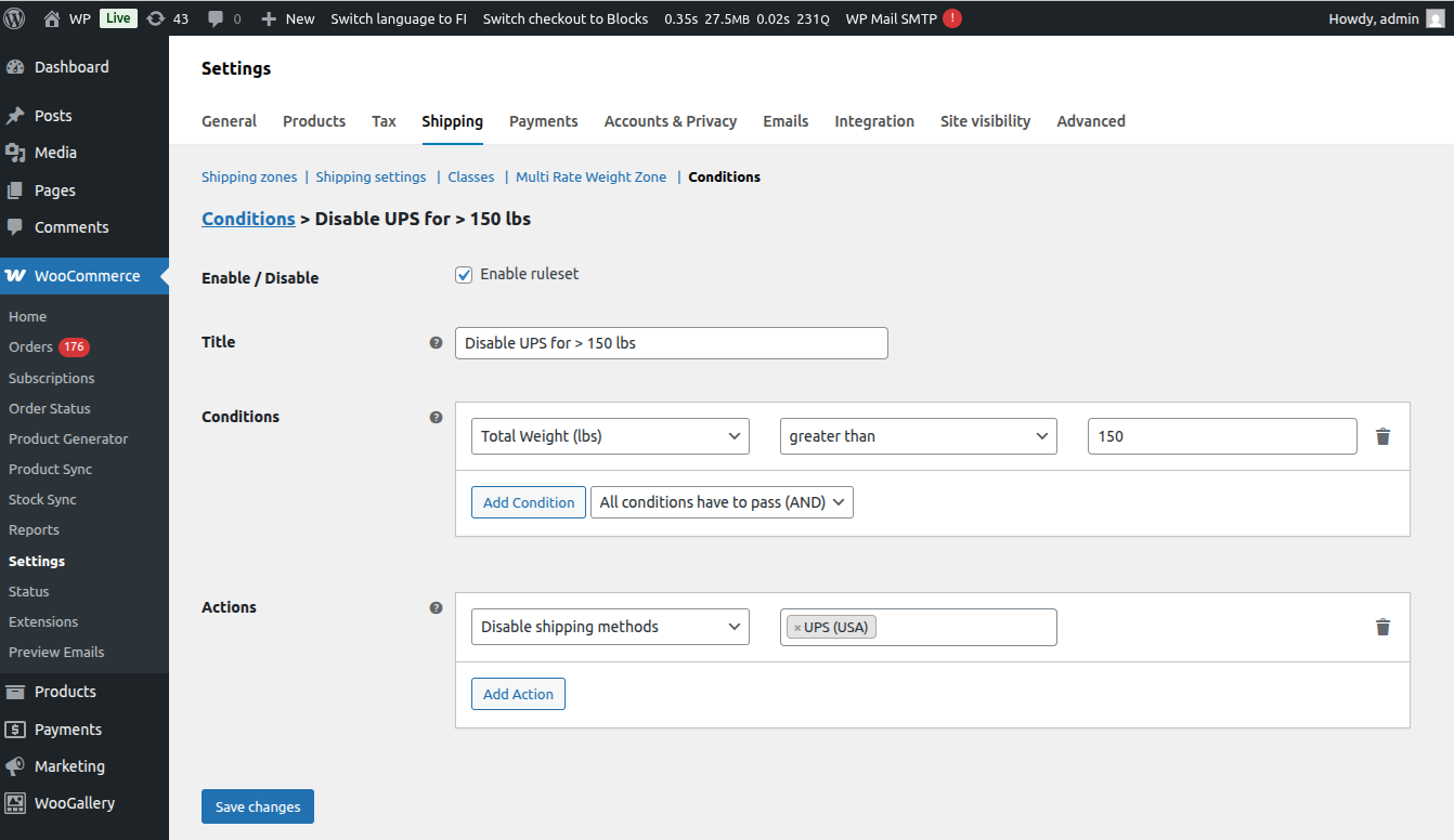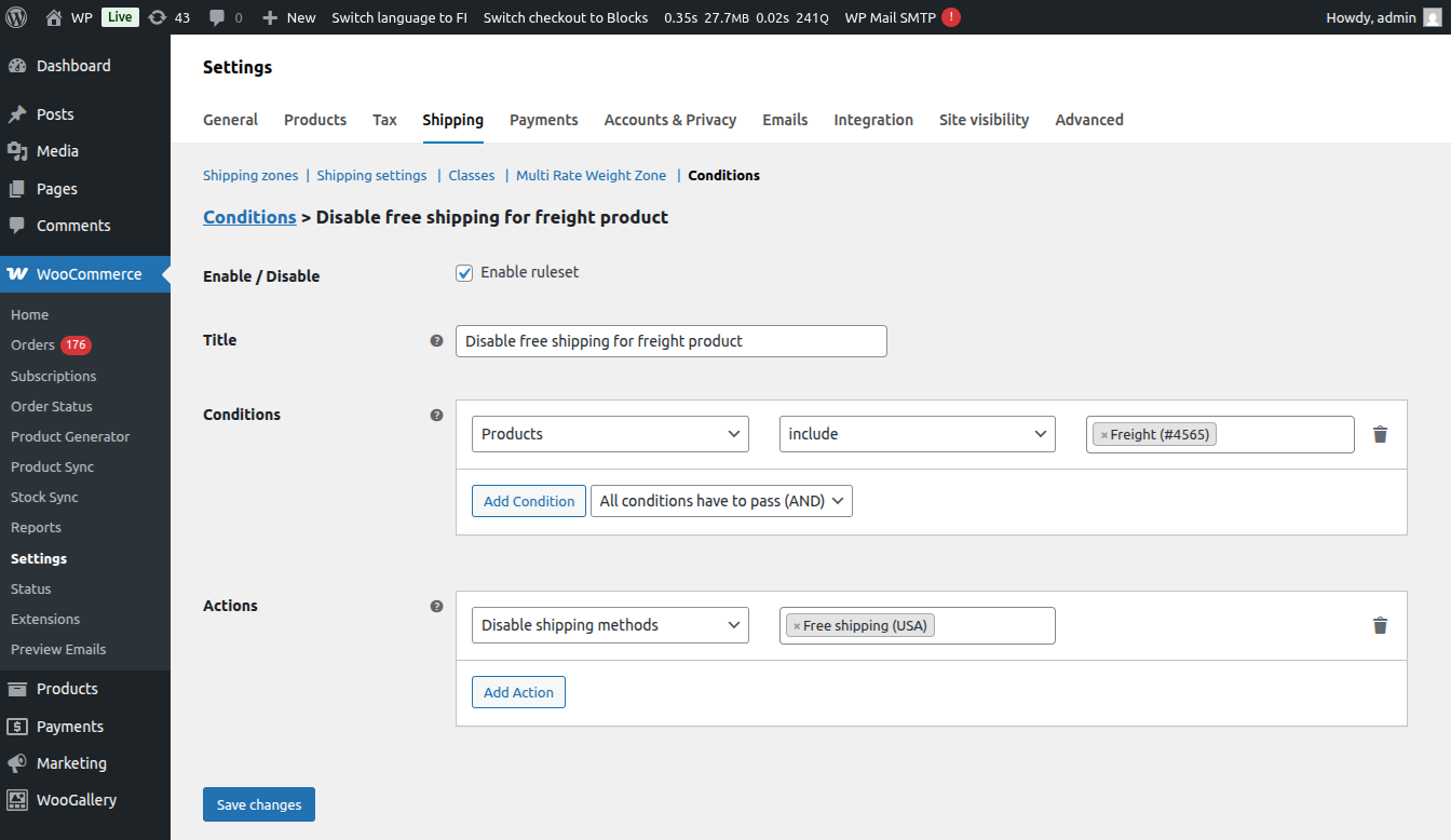 Once the plugin is activated, you can create rulesets at WooCommerce > Settings > Shipping > Conditions. Each ruleset comprises of conditions and actions which are run if conditions pass.