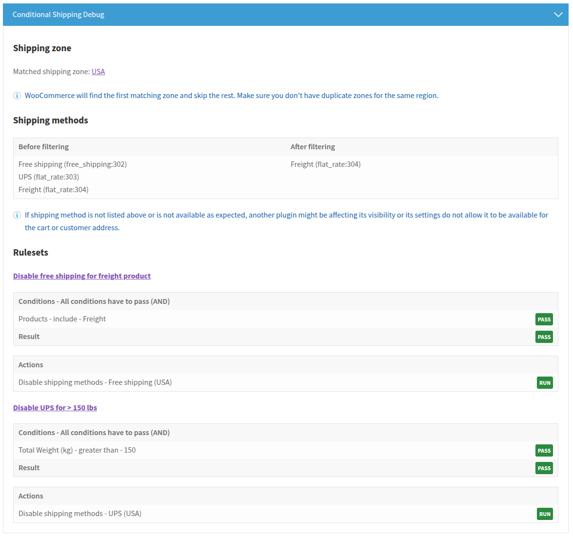 - Improved debug mode. It now shows active shipping zone and shipping methods before and after filtering